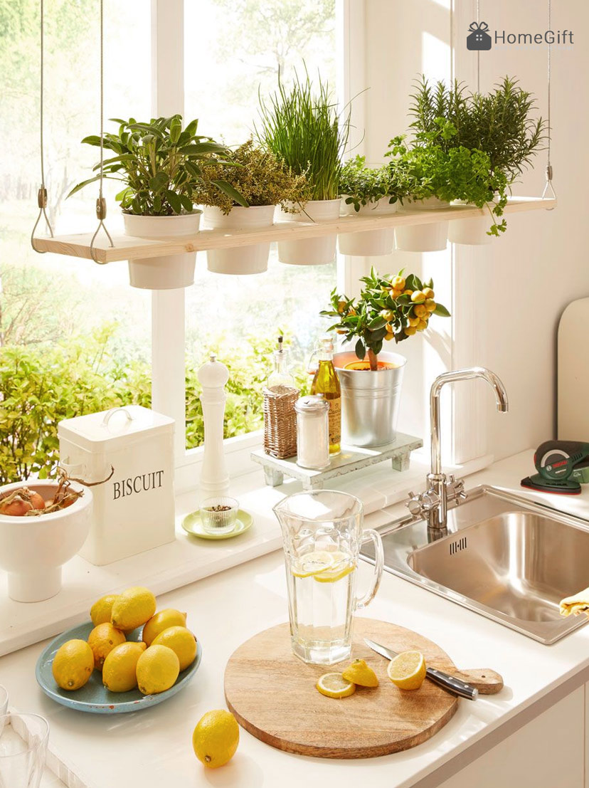 Cây xanh được bài trí trên những kệ treo tường trong phòng bếp một cách phù hợp sẽ giúp mang lại sự thoải mái và cải thiện tậm trạng rất tốt cho mỗi thành viên trong gia đình. Đồng thời nhiều cây xanh có thể hút mùi trong phòng rất tốt, trả lại bầu không khí trong lành hơn.