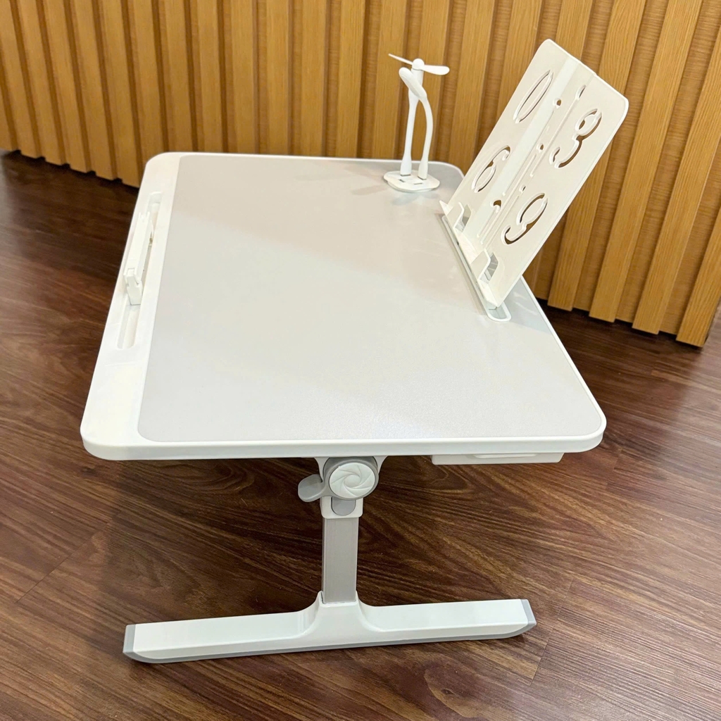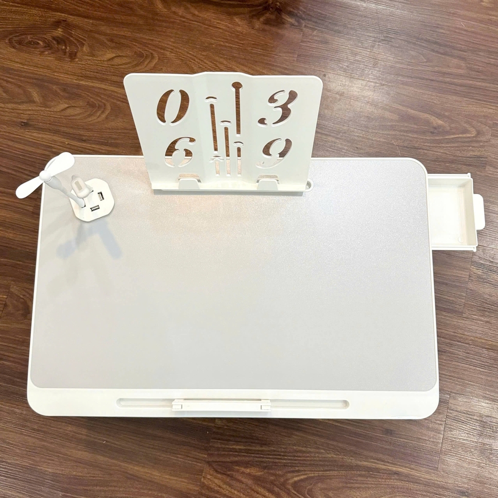 Tích hợp thanh chặn ipad/laptop, hộc để đồ, bộ cắm USB, quạt mini, đèn LED và giá để sách – hỗ trợ tối đa cho việc học tập và làm việc.