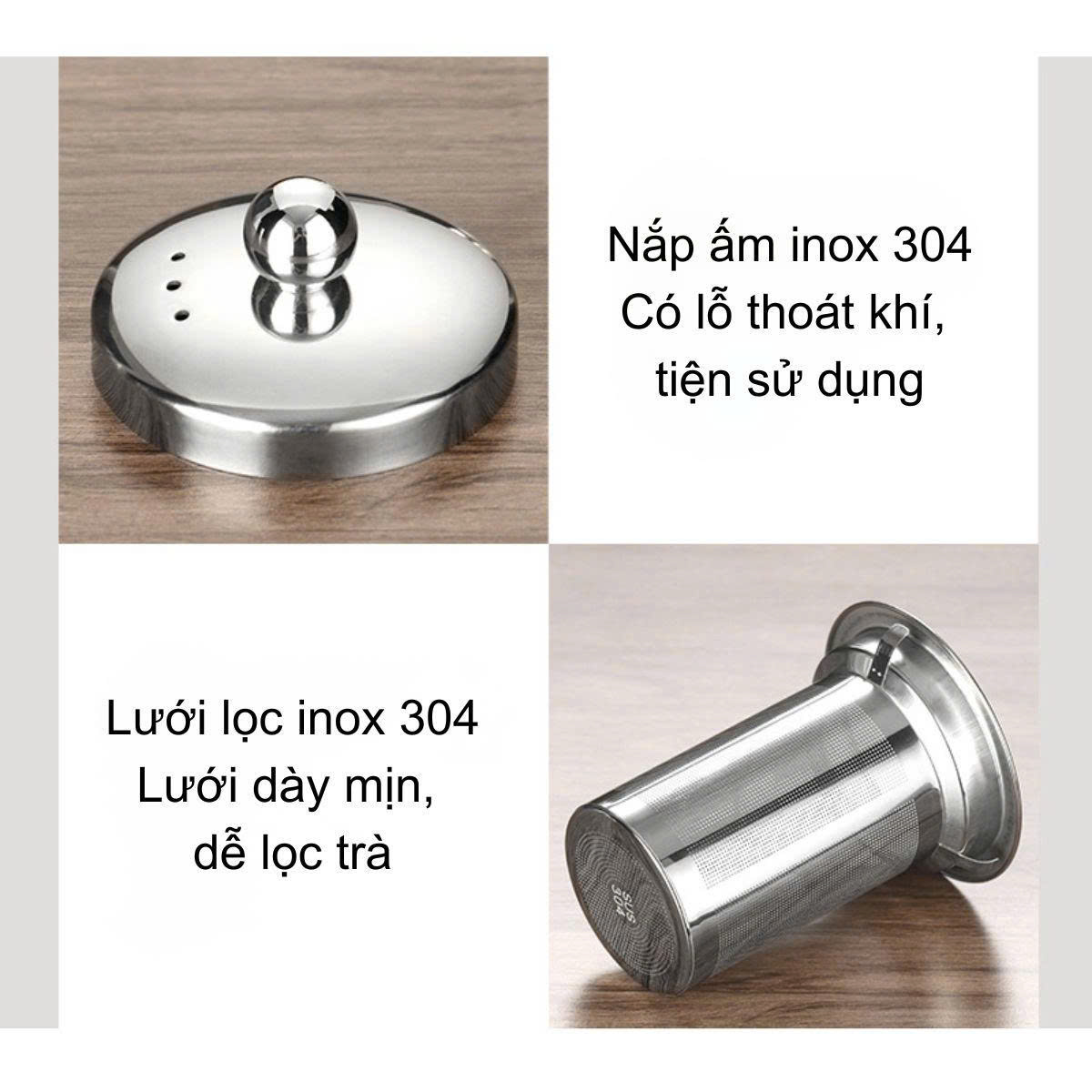 Bình được trang bị lõi lọc trà inox 304 chống gỉ, an toàn và bền bỉ.