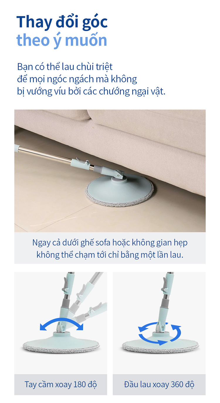 Đầu lau của bộ cây lau nhà Sweepy ETM972 có thiết kế dạng tròn và diện tích khá lớn. Đặc biệt, đầu lau có thể điều chỉnh góc theo ý muốn để lau chùi linh hoạt mọi ngóc ngách trong nhà hoặc điều chỉnh phù hợp với chiều cao để khi lau dọn không bị mỏi lưng. Kết hợp với thiết kế xoay 360 độ giúp bạn làm sạch ngay cả các khu vực dưới gầm bàn, gầm giường, ghế một cách dễ dàng.