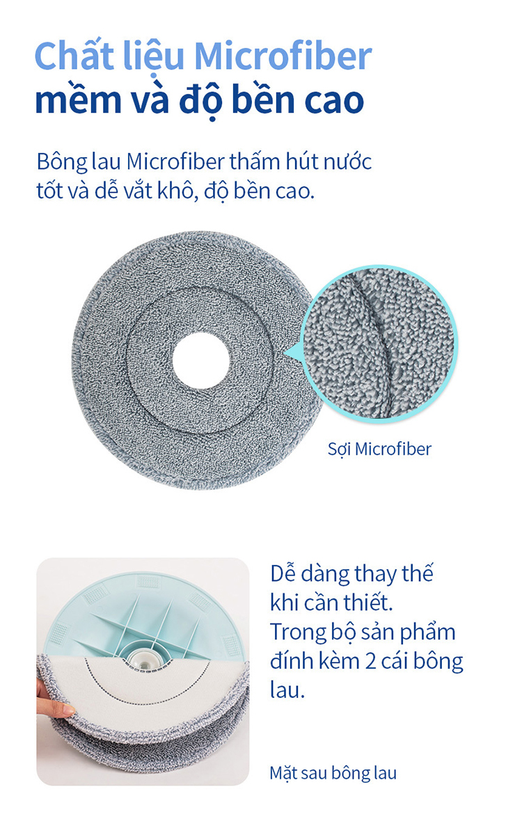 Khác với các bộ lau nhà xoay 360 độ với bông lau sợi lớn, bộ cây lau nhà Sweepy ETM972 sử dụng bông lau microfiber với sợi nhỏ và mịn. Chất liệu này giống với các loại bông lau sử dụng cho cây lau nhà vắt phẳng, cho hiệu quả làm sạch tuyệt vời.