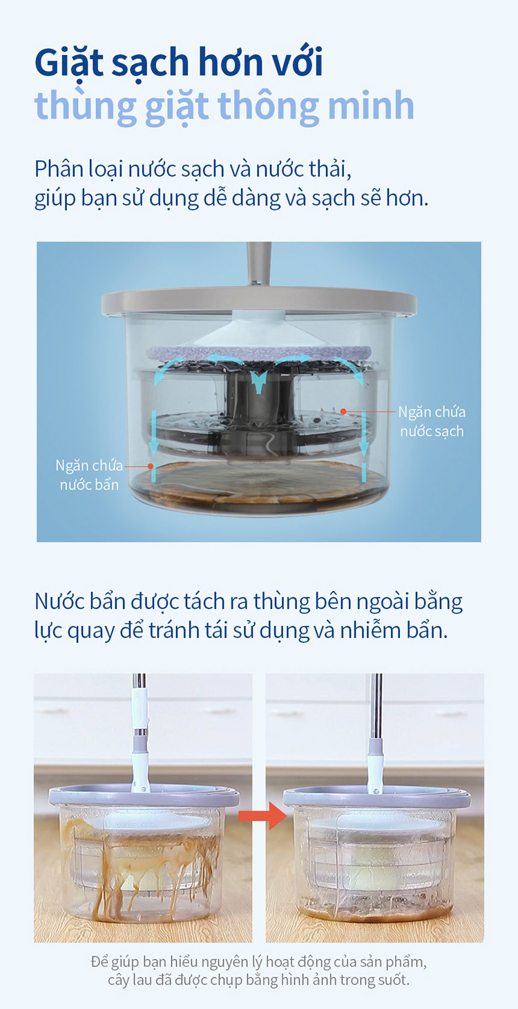 Cấu tạo của thùng vắt độc đáo với ngăn chứa nước sạch riêng. Khi nhấn giặt bông lau thì nước sạch sẽ bơm lên để làm sạch bông lau, nước bẩn tách ra ngăn chứa riêng nên sẽ không tái sử dụng nữa. Nhờ vậy nên bông lau đảm bảo được làm sạch một cách hiệu quả nhất.