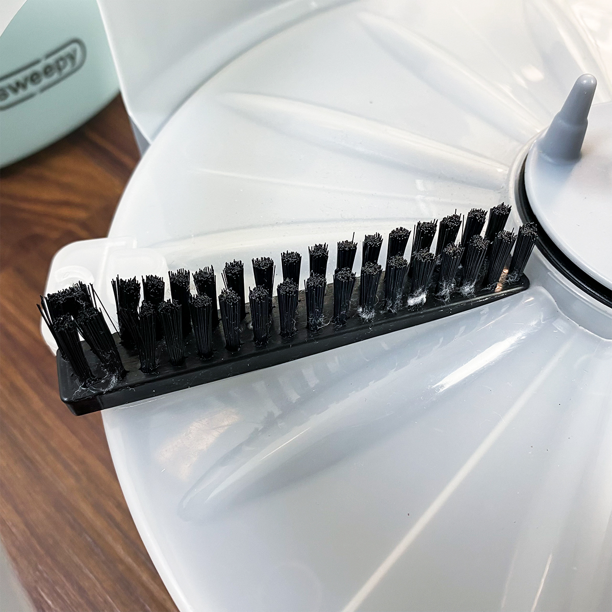 Ngoài ra, trên nắp lồng quay, hãng cũng thiết kế thêm một phần chổi để tăng cường khả năng giặt sạch. Các bụi bẩn bám trên bông lau như tóc, rác… sẽ bị chổi tách ra và loại bỏ theo nước bẩn. Chẳng cần động tay, thiết kế này giúp bạn giặt sạch bông lau hiệu quả hơn rất nhiều so với các loại cây lau nhà xoay tay khác.
