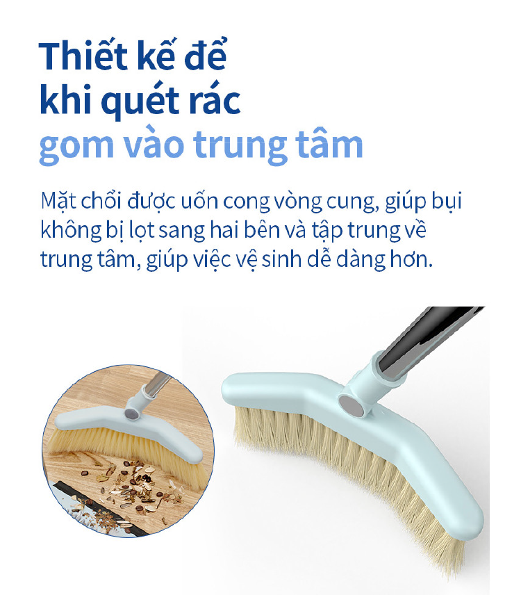 Thiết kế để khi quét rác gom vào trung tâm: Mặt chổi được uốn cong vòng cung giúp bụi không bị lọt sang 2 bên và tập trung về trung tâm, giúp việc vệ sinh dễ dàng hơn.