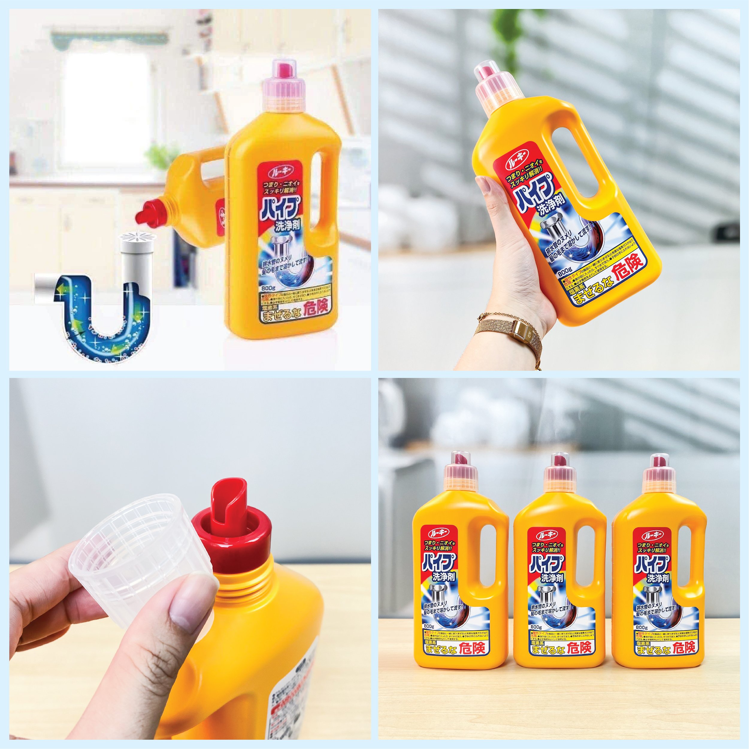 - Đổ trực tiếp chất lỏng từ chai vào miệng cống hoặc đường ống bồn rửa bát, bồn tắm, lavabo..