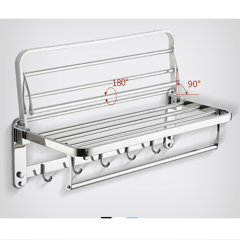 Giàn treo khăn B01 gồm nhiều thanh ngang được sắp đặt hợp lý và cực kỳ chắc chắn, bạn có thể để quần áo, phụ kiện tắm trên kệ, treo vắt khăn bên dưới thật gọn gàng, tiện lợi khi sử dụng. Giàn treo khăn B01 còn được gắn thêm 6 móc treo bên dưới giúp bạn treo móc được nhiều vật dụng khác nhau. Đặc biệt, kệ để đồ bên trên có thể gập lên 90 độ để tiết kiệm diện tích khi không sử dụng.
