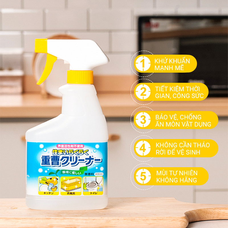 Chai xịt baking soda 400ml Rocket Nhật Bản: với hoạt chất tẩy rửa an toàn, thân thiên với môi trường. Có tác dụng tẩy sạch các vết bẩn cứng đầu bám trên bề mặt như: bồn rửa mặt, bồn cầu, bồn tắm, sàn nhà, vết bẩn trên quần áo, lò vi sóng. Giúp làm sạch các vết bẩn cứng đầu nhanh chóng. Mang lại vẻ sáng bóng cho đồ dùng hay bề mặt cần tẩy rửa. Thiết kế dạng chai xịt tiện lợi, dễ sử dụng.