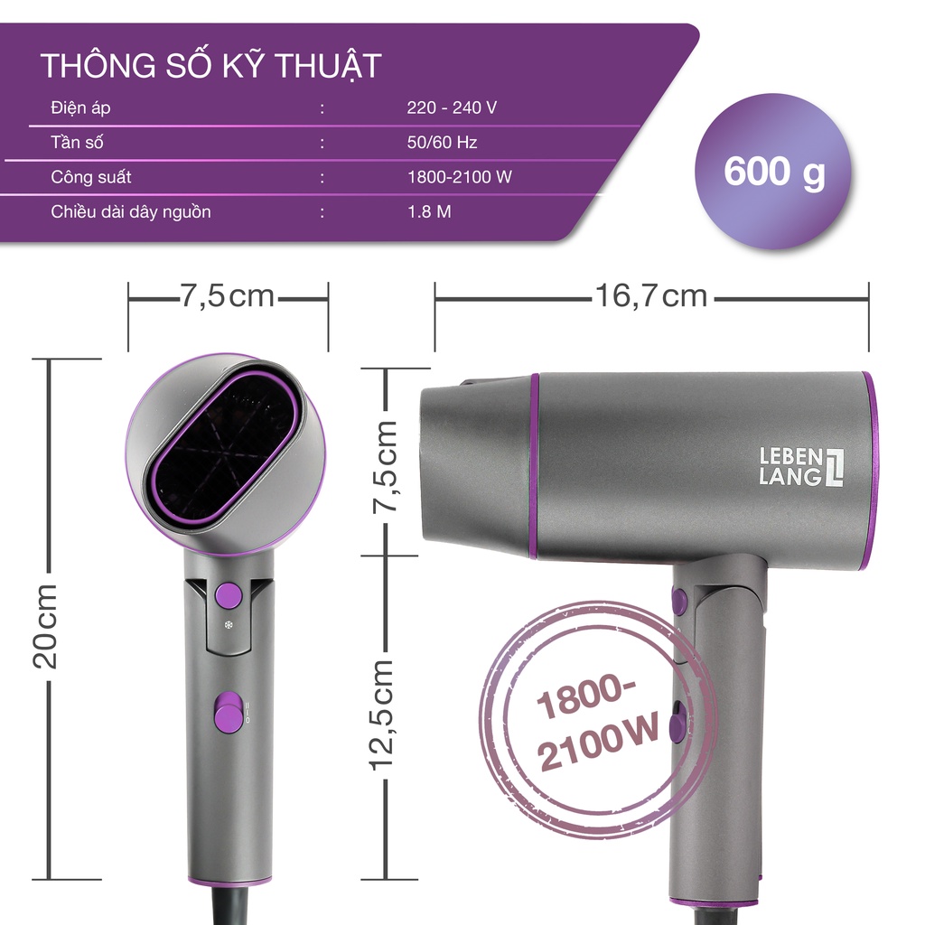 Máy sấy Lebenlang sử dụng 6 cánh quạt, nhờ đó có thể giúp làm khô tóc nhanh chóng, mà không gây tổn hại đến da đầu người dùng, bên cạnh đó còn giúp tóc khỏe mạnh và bồng bềnh.
