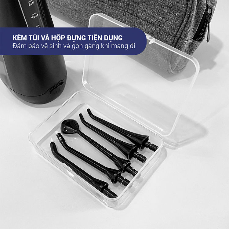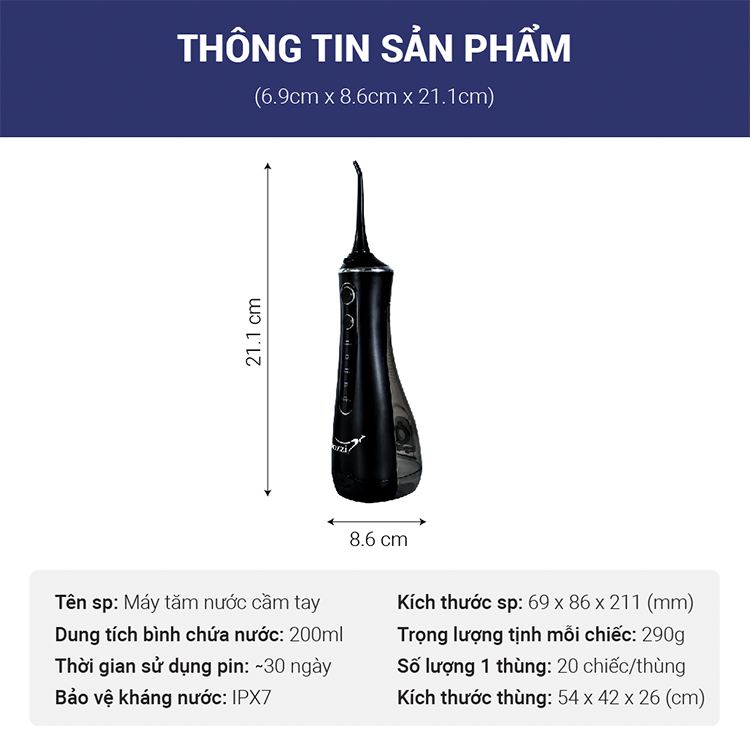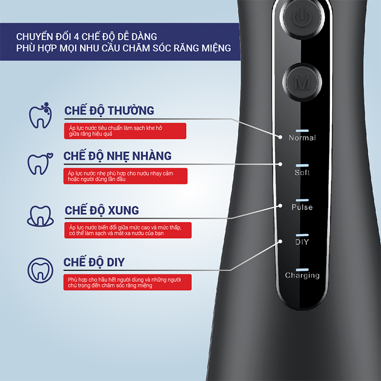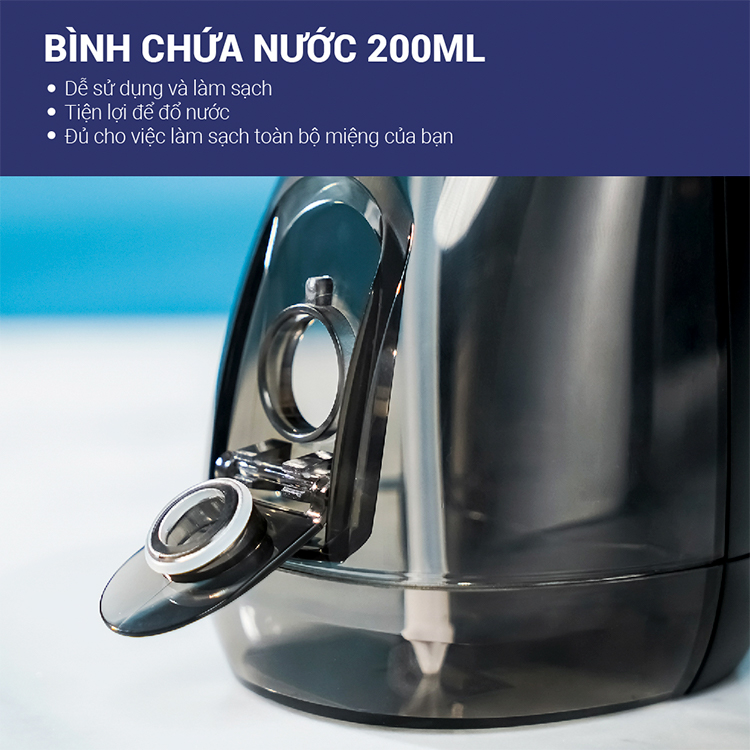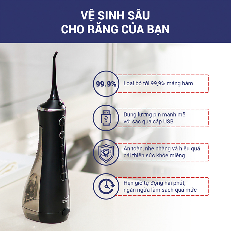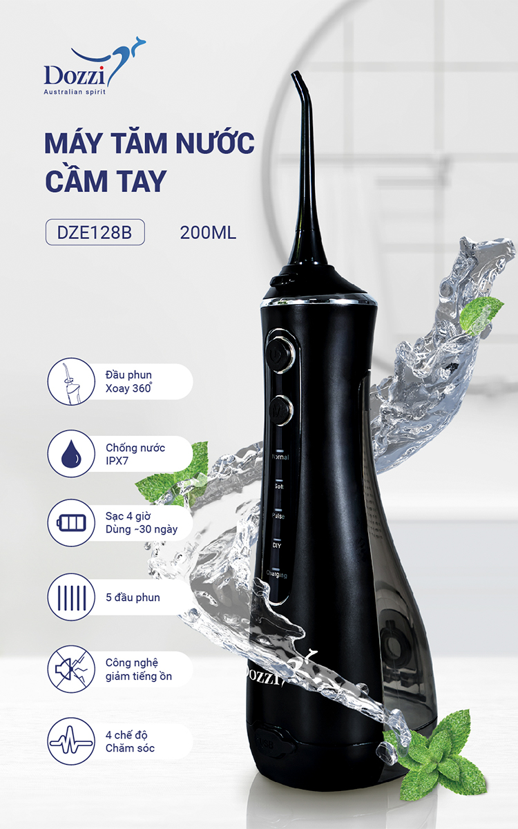Máy tăm nước Dozzi DZE218B là một thiết bị vệ sinh răng miệng hiện đại ngày càng trở nên phổ biến và là đồ dùng cá nhân không thể thiếu cho mỗi người. Sản phẩm sử dụng áp lực nước mạnh từ vòi phun để loại bỏ thức ăn thừa, các mảng bám cứng đầu trong các kẽ răng, nướu và khoang miệng, ngăn chặn sự phát sinh phát triển của vi khuẩn, đem đến hơi thở thơm mát, dễ chịu, tự tin giao tiếp với mọi người.