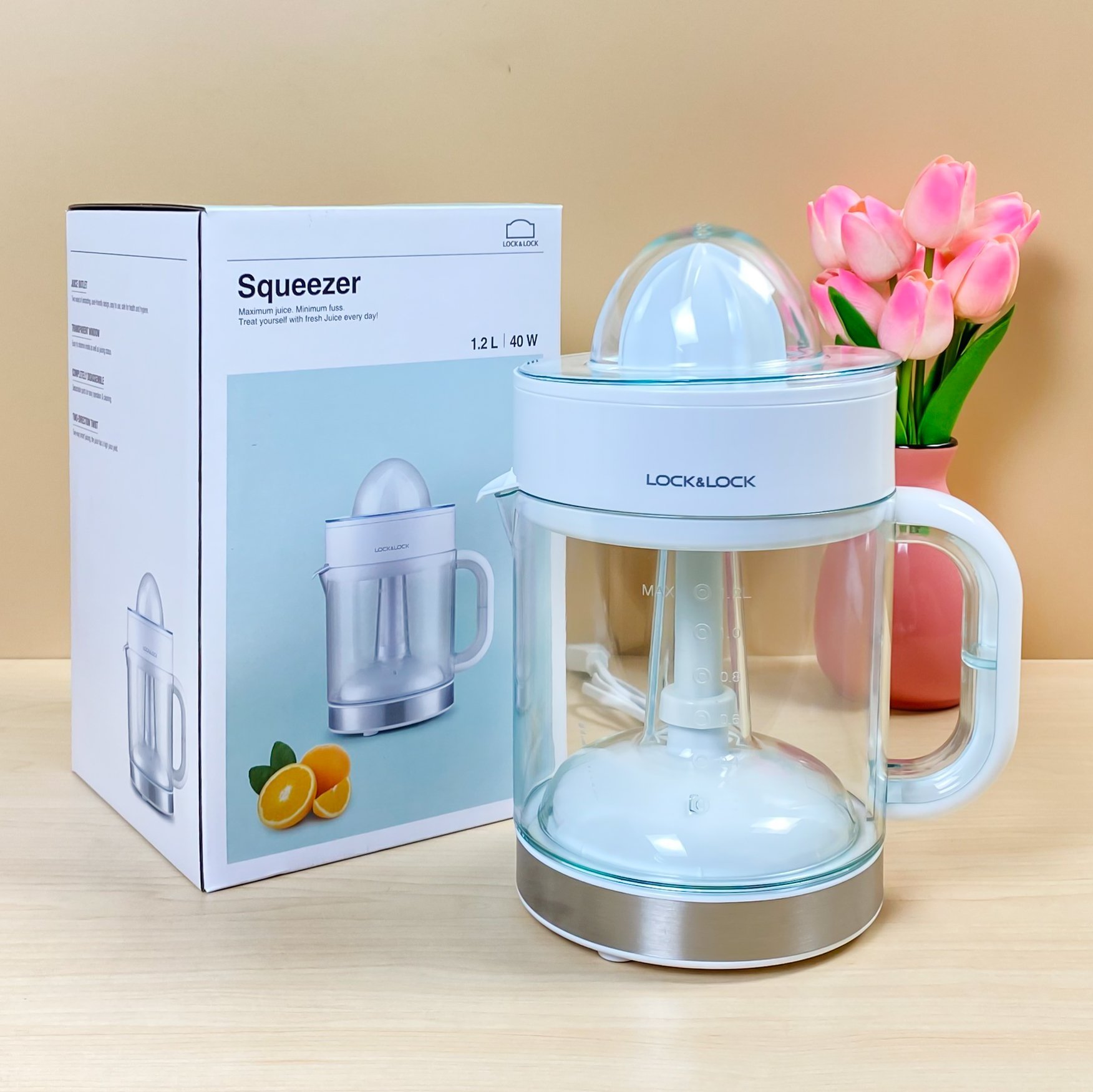 Được sản xuất trên dây chuyền tự động hóa hiện đại với độ chính xác cao, cùng thiết kế thông minh, sản phẩm có bình đựng trong suốt giúp bạn quan sát được lượng ép bên trong. Hơn nữa, nắp đậy bảo vệ bên ngoài và nắp đậy đầu vắt bên trong giúp bảo vệ kín đáo, ngăn ngừa bụi bẩn, vi khuẩn xâm nhập hiệu quả. Quai cầm dày chắc kết hợp cùng miệng rót trên bình đựng giúp bạn thực hiện các thao tác cầm nắm, rót nước ép dễ dàng. Ngoài ra, máy có công suất chỉ 40W cho khả năng hoạt động ổn định, êm ái và không tốn nhiều điện năng.