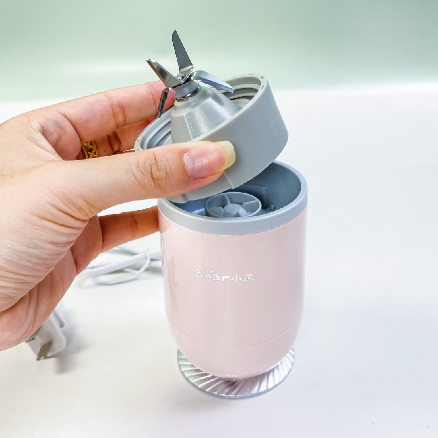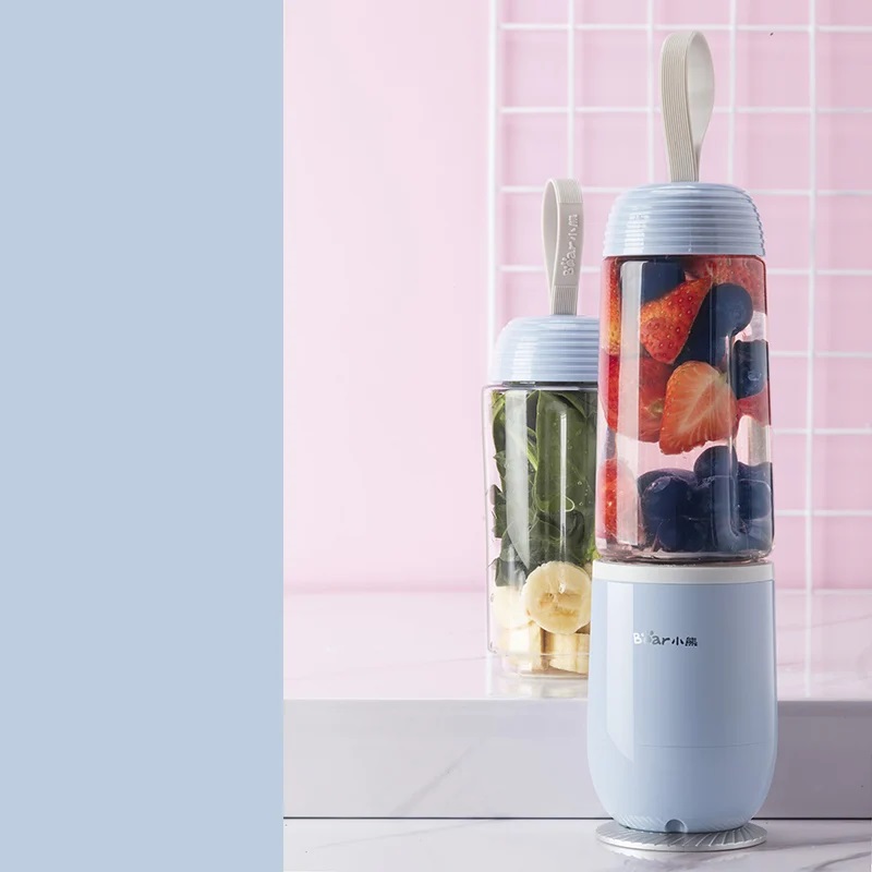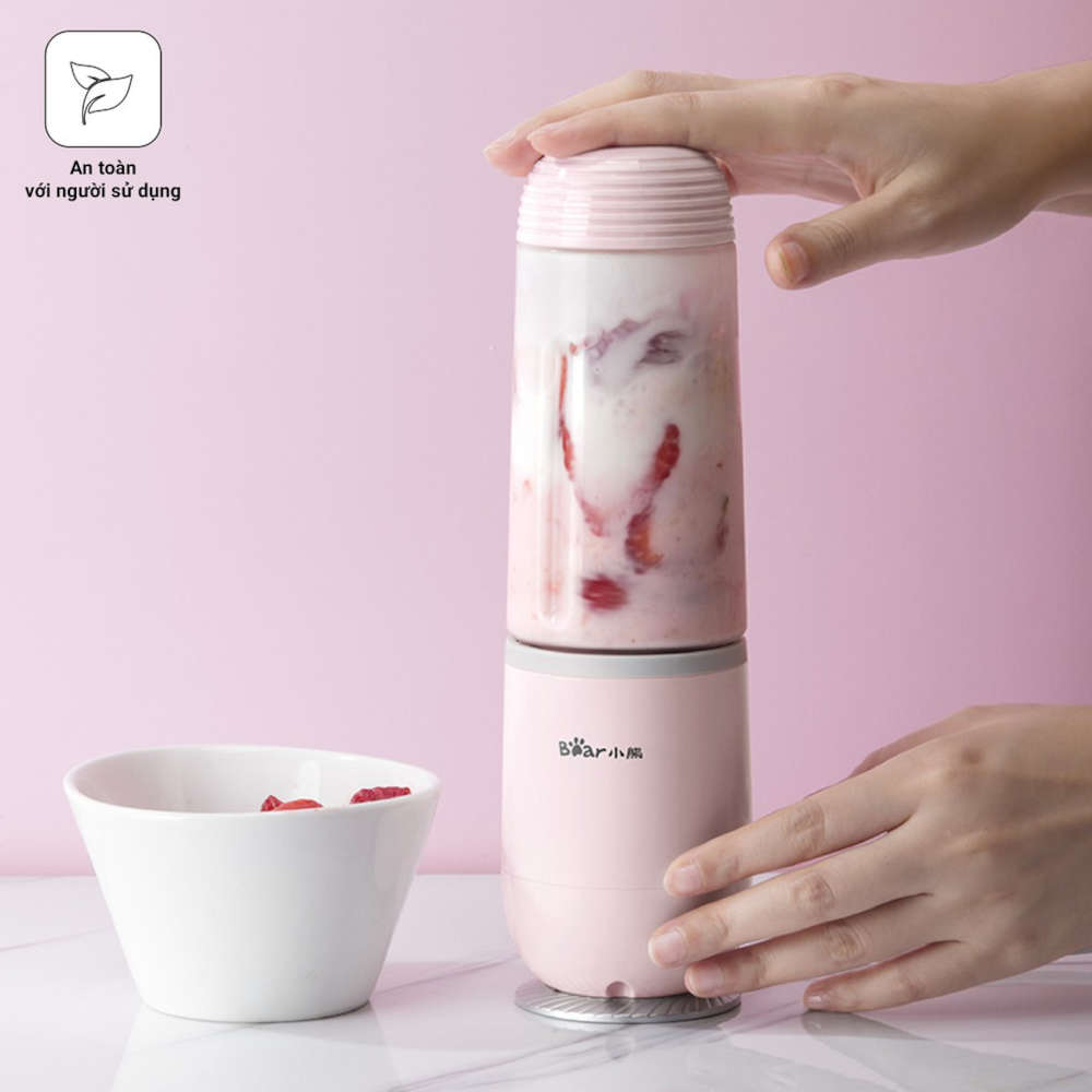 Máy xay sinh tố cầm tay Bear D04B1 kiêm bình nước thiết kế nhỏ gọn, màu sắc trẻ trung, tươi tắn, tiện mang theo, sử dụng được mọi lúc mọi nơi. Máy xay nhỏ gọn tiện lợi, có quai xách trên nắp máy xay dễ dàng cầm nắm, di chuyển, bỏ gọn vào balo, túi đựng mang theo đi học, tập thể dụng, đi picnic, cắm trại,...