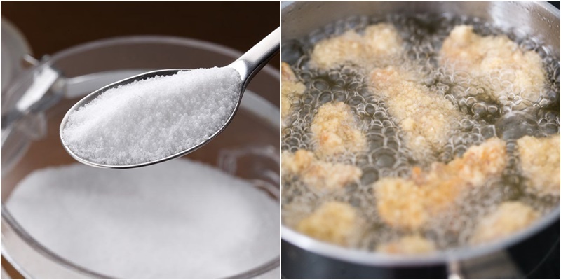 Muối có công dụng khử các độc tố trong dầu và hỗ trợ giảm tình trạng lượng dầu chiên bắn ra ngoài rất hiệu quả. Khi cho muối vào dầu trước khi chiên sẽ giúp thành phẩm cá chiên của bạn được giòn, không bị văng dầu khắp nơi và sẽ dàng lật mặt cá hơn.