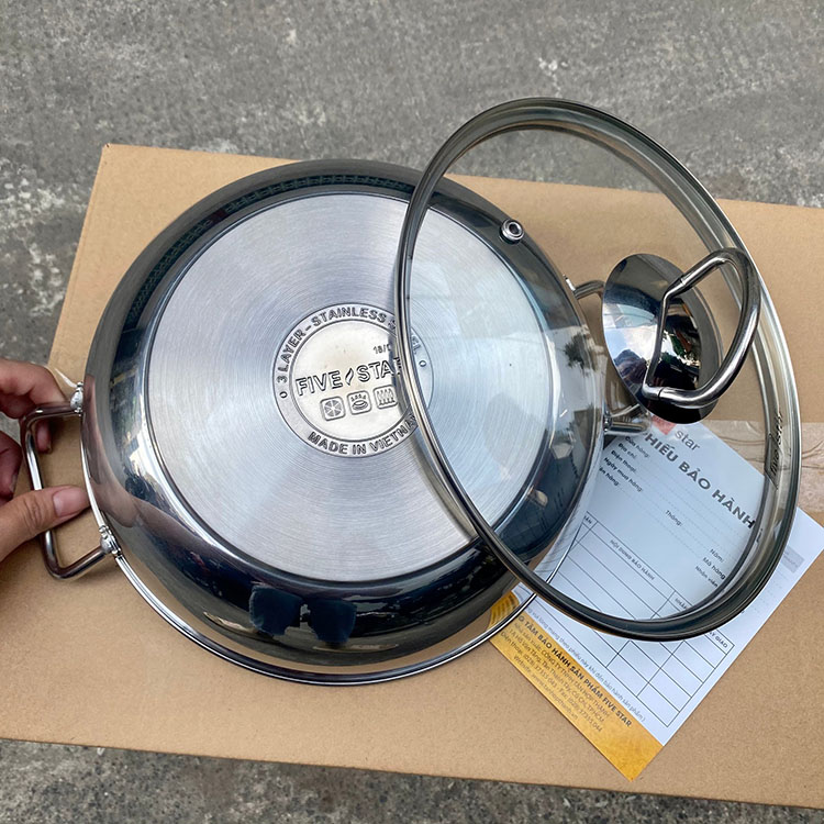 Đáy 3 lớp: Lớp inox 430 ngoài cùng có đặc tính nhiễm từ, lớp nhôm ở giữa giúp thu nhiệt nhanh và dẫn nhiệt tỏa đều, lớp trong cùng là inox 430 phủ chống dính ít bị oxi hóa, ít phản ứng với thức ăn, đảm bảo an toàn.