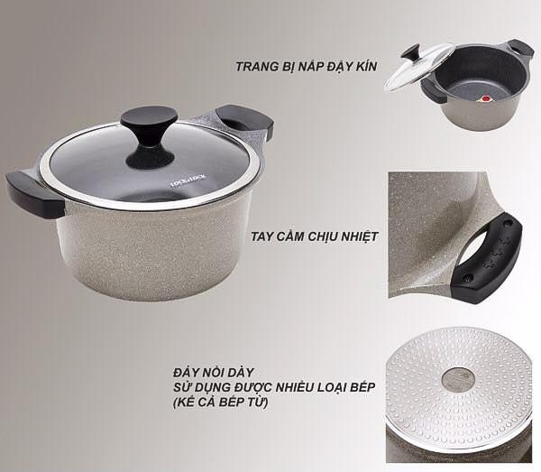 Bên ngoài là lớp phủ đá ceramic, cung cấp hiệu suất chống dính cao và độ bền bỉ cho sản phẩm, đồng thời giúp giữ nhiệt tốt, cho thức ăn trong nồi nóng lâu hơn.