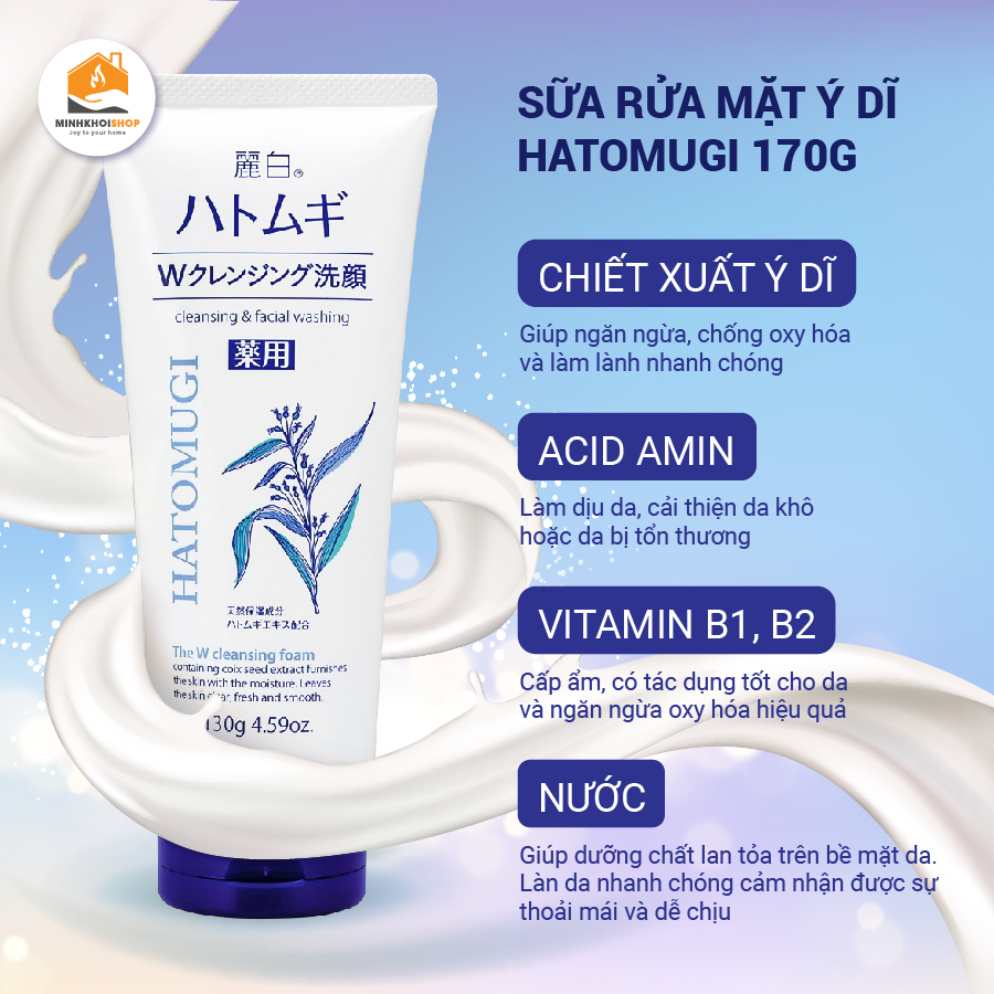 - Hạt ý dĩ chính là nguyên liệu chính trong sữa rửa mặt Hatomugi này, trong ý dĩ chứa nhiều khoáng chất và 9 loại acid amin giúp ngăn ngừa và làm lành các vết thương hiệu quả. Đây là nguyên liệu thích hợp cho nhiều công thức dưỡng da.