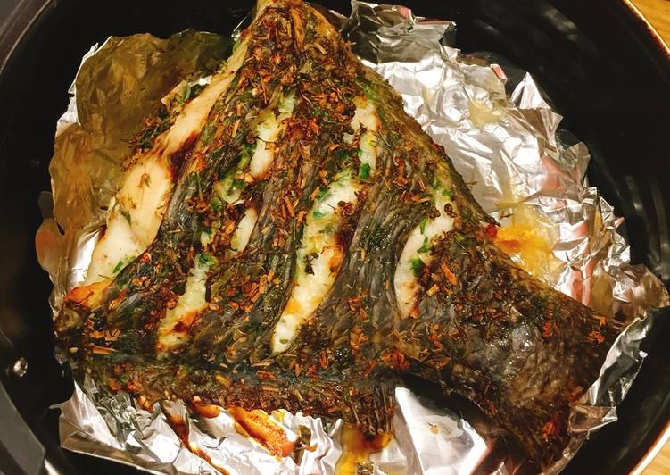- Lấy xả nhét vào ruột cá, đặt cá lên giấy bạc đã xếp gia vị rắc bột cà ri và hạt nêm sau đó lật cá lại rắc bên còn lại và xếp hành ớt còn lại lên trên, gấp giấy bạc lại cho vào nồi chiên không dầu nướng 200 độ, thời gian 20 phút.